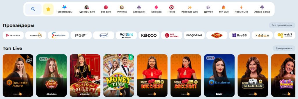 - Игровые шоу — Crazy Time, Monopoly Live, Deal or No Deal, Mega Ball.