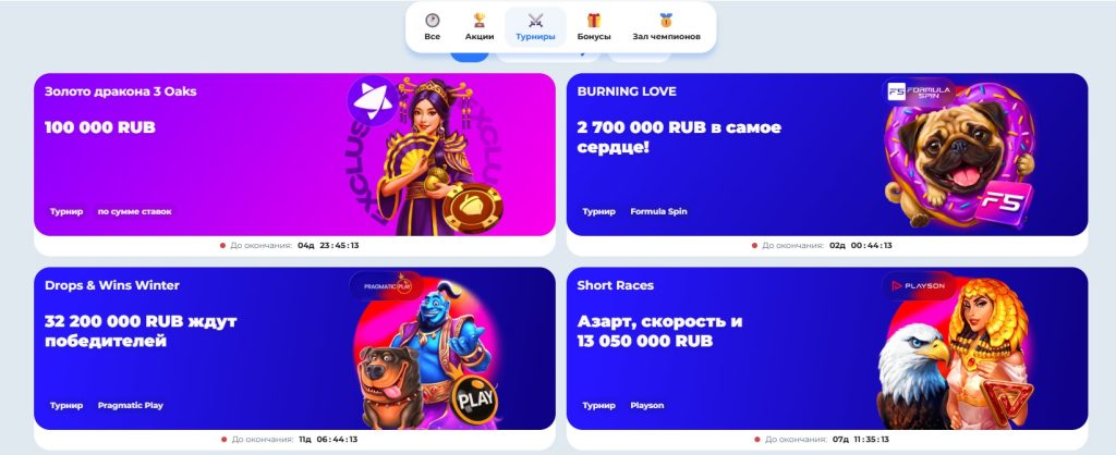 - Слот-турниры — соревнование по сумме выигрышей или количеству спинов за определённый отрезок времени.