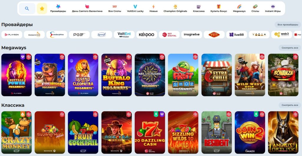 RTP большинства слотов в каталоге Champion Slots — от 94% до 98%. Точное значение для каждой игры можно проверить прямо в интерфейсе слота, нажав иконку «i».